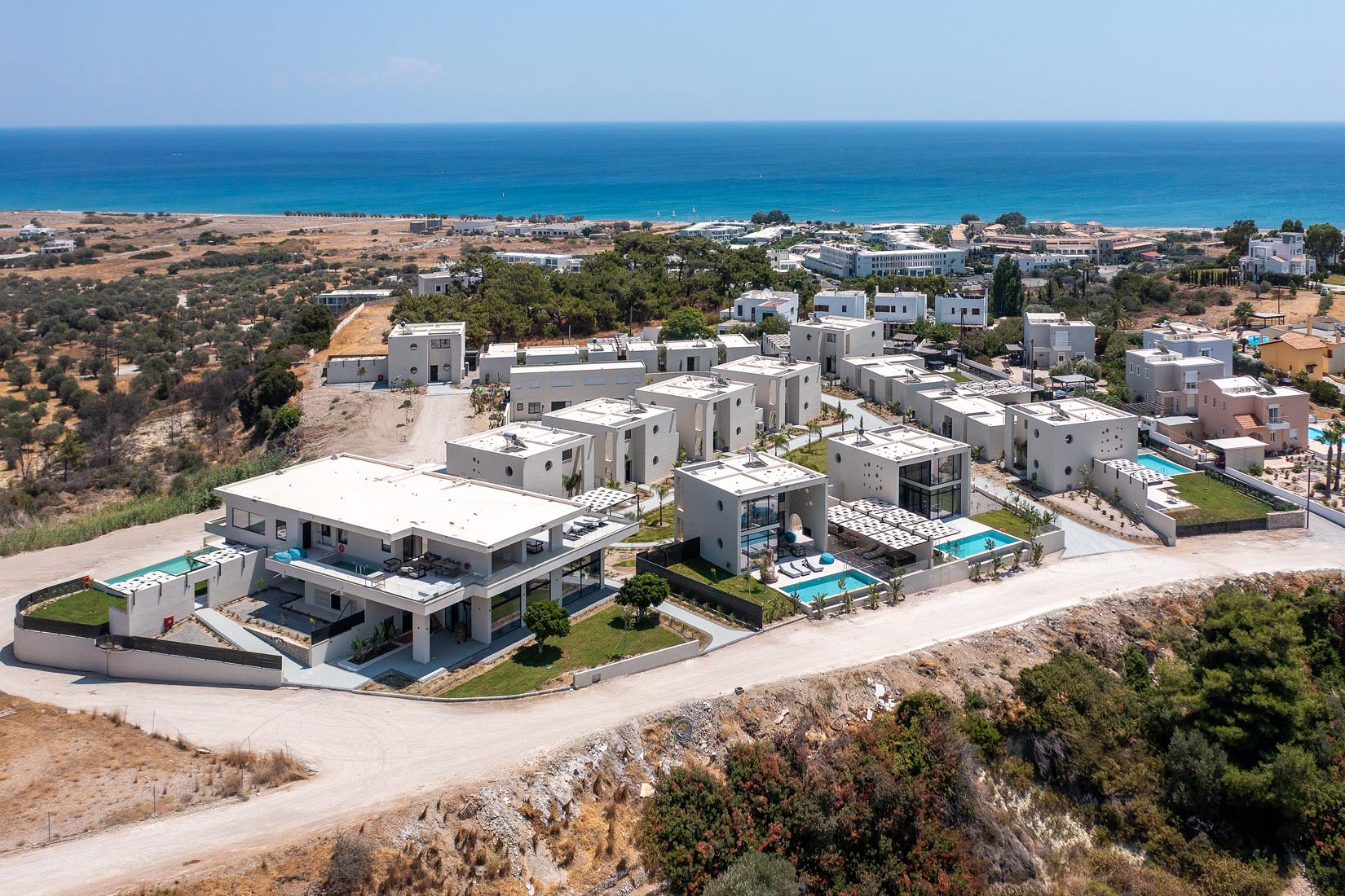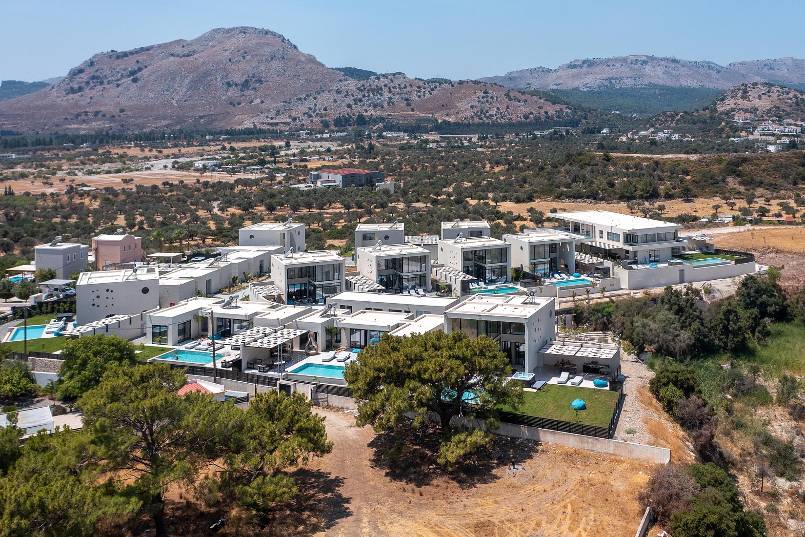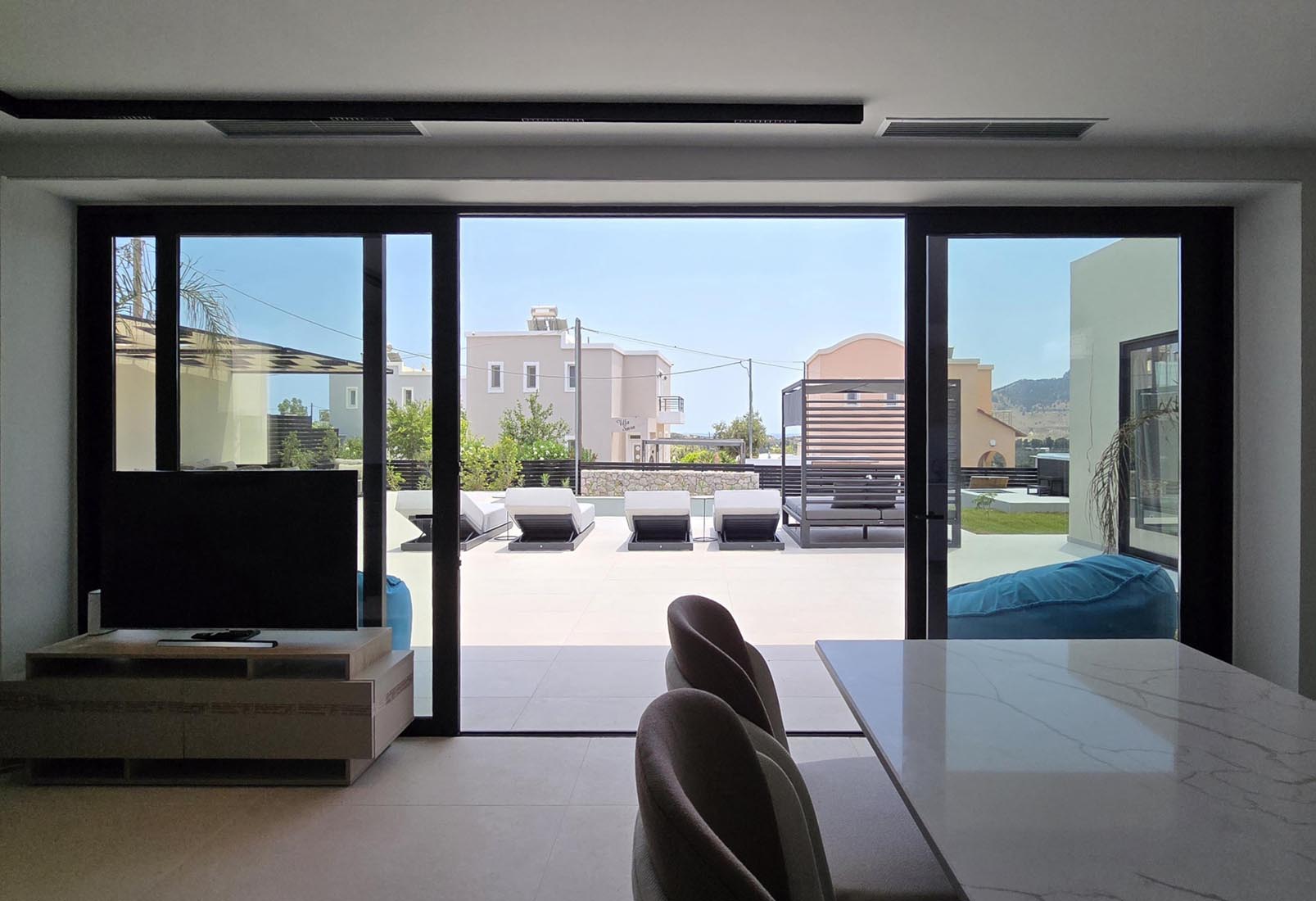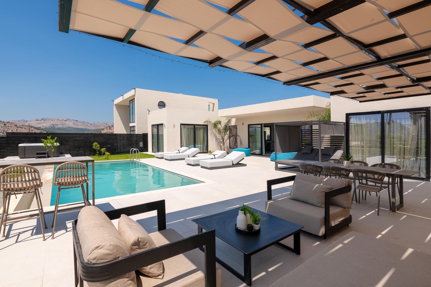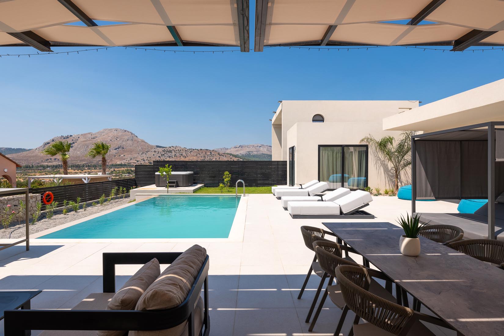 Type A villas are one floor detached luxury villa that hosts up to 6 guests. There are 3 fully air-conditioned bedrooms with unique decorations. All of the bedrooms offer ensuite bathrooms with a shower. There’s a fully equipped kitchen in warm colors, suitable for any meal preparation accompanied by the seating area and the living room. There’s a smart TV and free WIFI access throughout the property. Outdoors, there’s a private swimming pool and jacuzzi with sunbeds and a seating area where you can relax under the rays of the Aegean sun. You can spend your time by your private swimming pool or enjoy a fresh meal prepared in the BBQ installation. Also, there is a shared outdoor gym, so you can stay fit throughout your holidays in Rhodes. As for your entertainment you will find a sharing ping pong table,mini golf& pool table. This amazing property and the beautiful location make the perfect match for a memorable stay and unforgettable holidays in Rhodes!