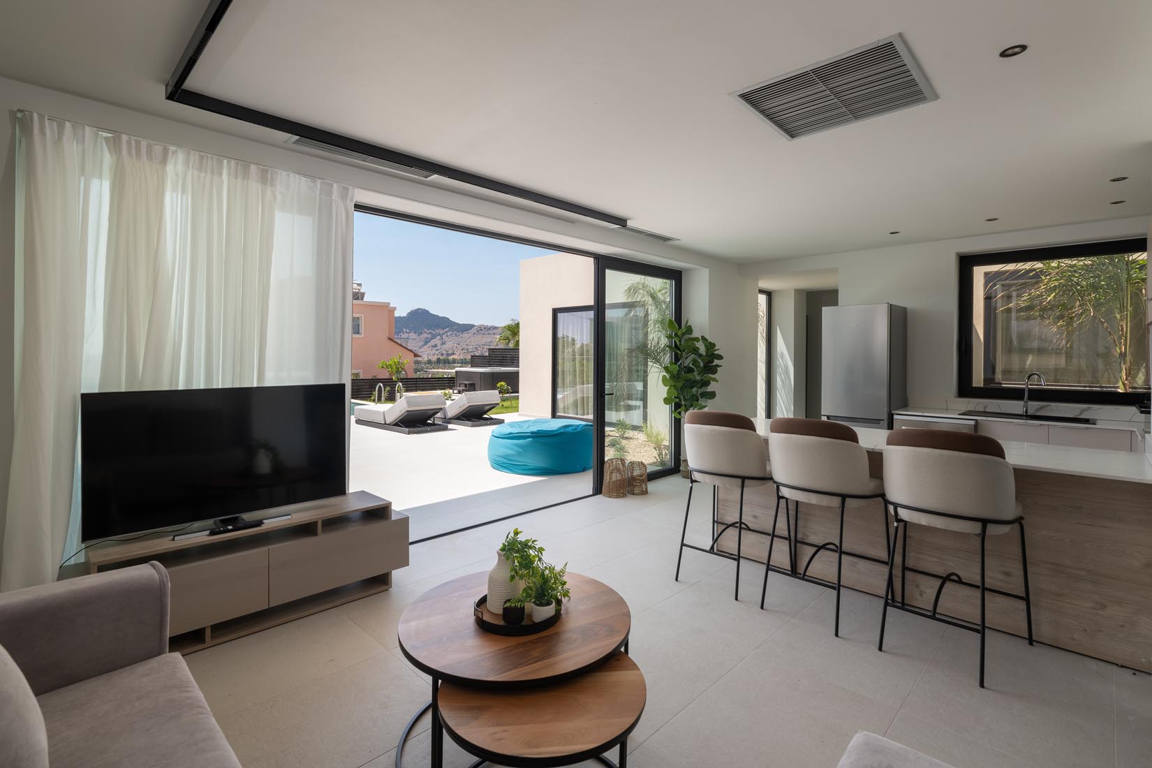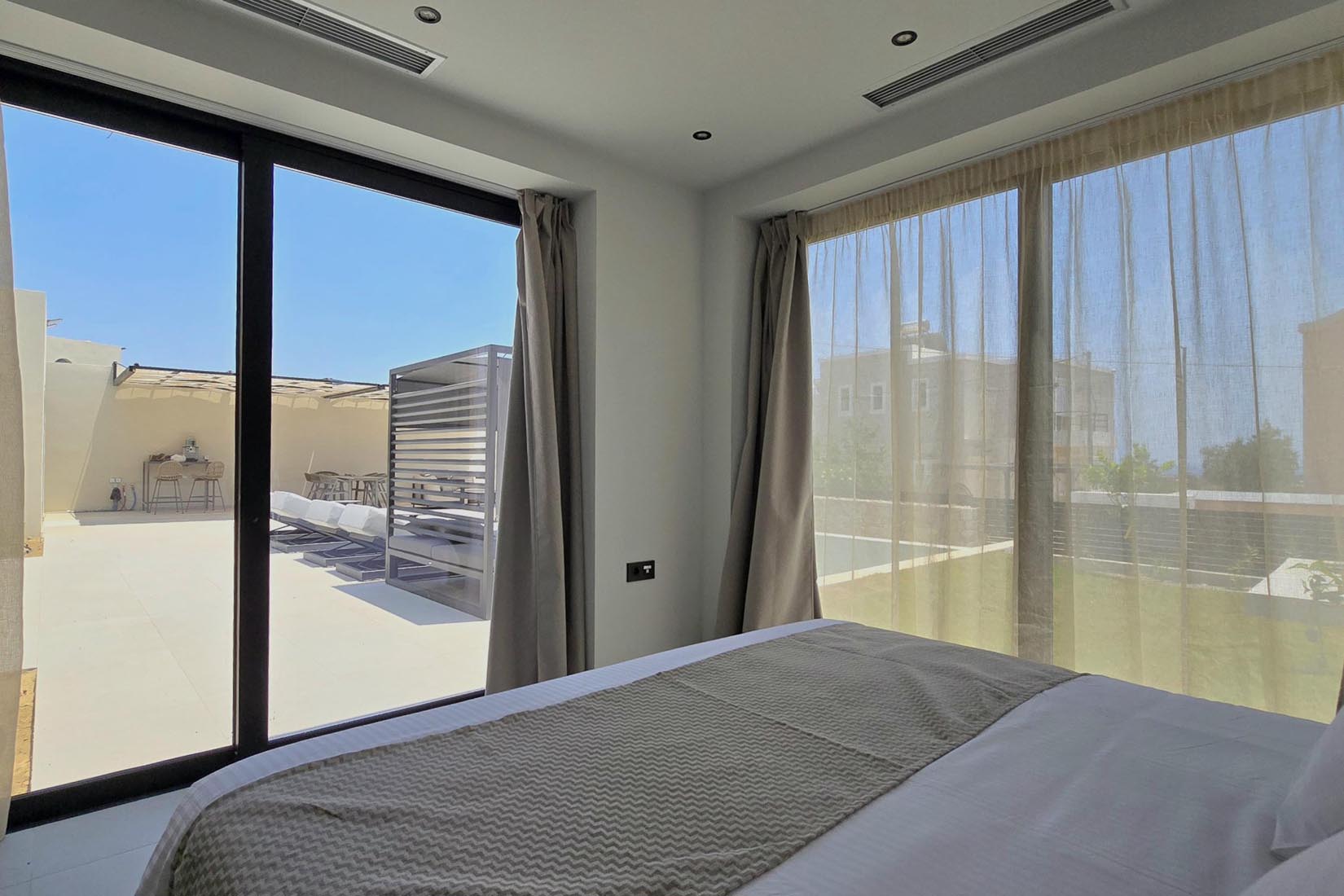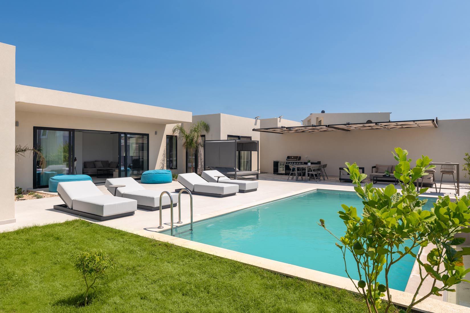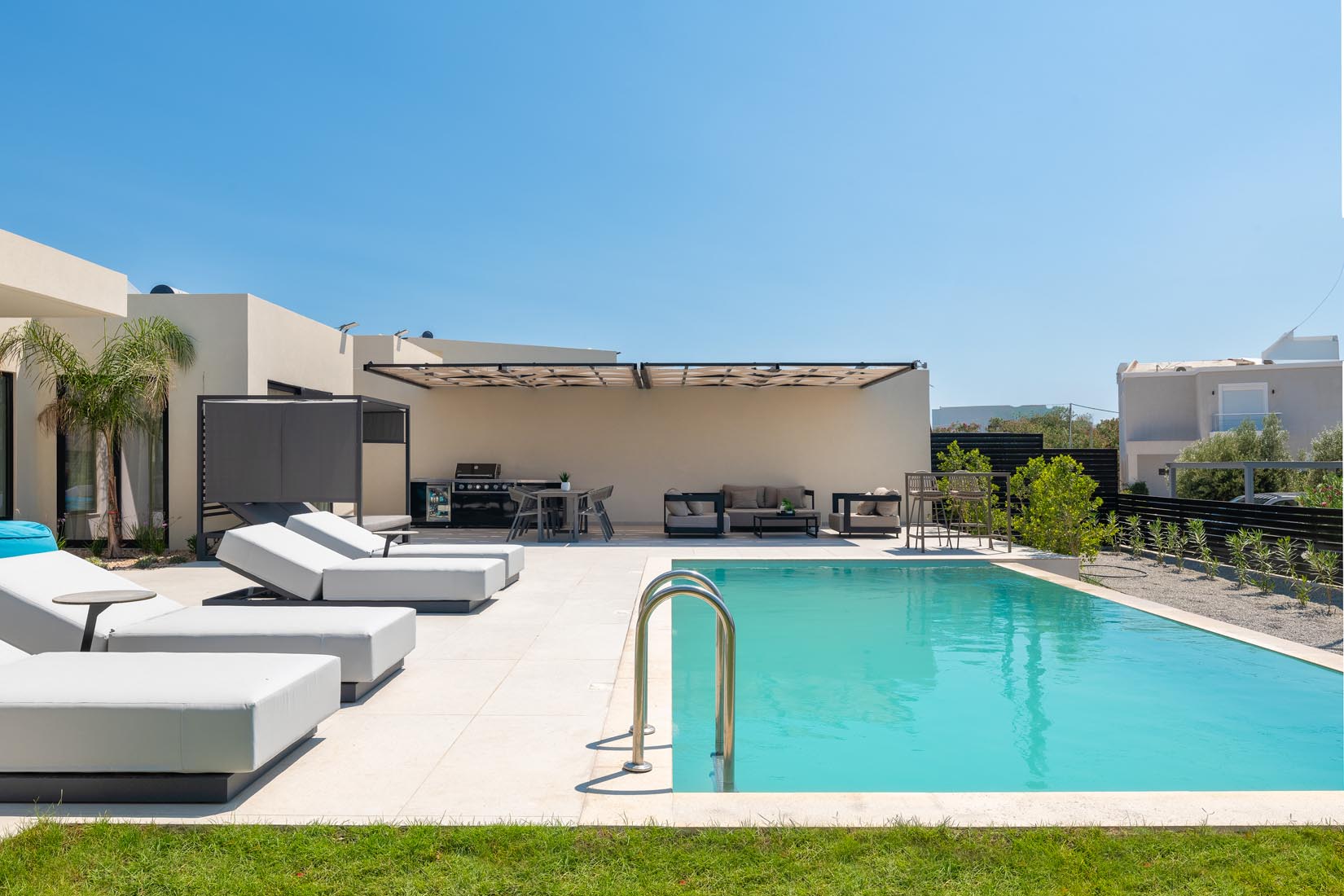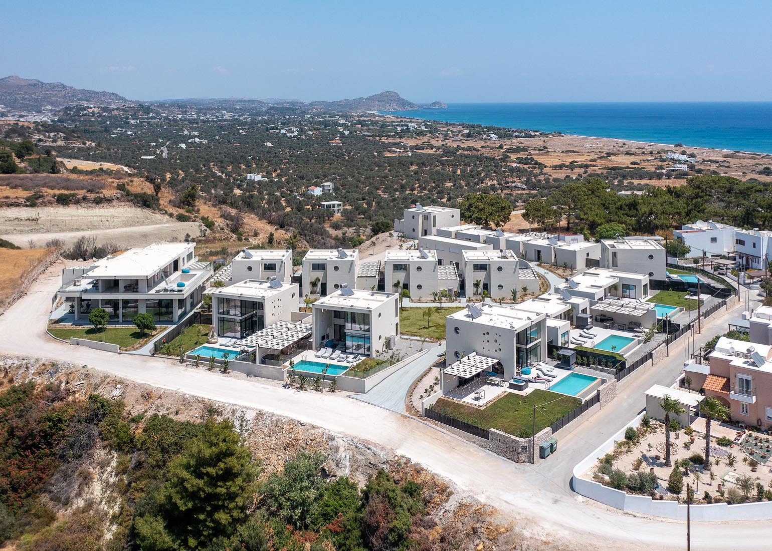 Type A villas are one floor detached luxury villa that hosts up to 6 guests. There are 3 fully air-conditioned bedrooms with unique decorations. All of the bedrooms offer ensuite bathrooms with a shower. There’s a fully equipped kitchen in warm colors, suitable for any meal preparation accompanied by the seating area and the living room. There’s a smart TV and free WIFI access throughout the property. Outdoors, there’s a private swimming pool and jacuzzi with sunbeds and a seating area where you can relax under the rays of the Aegean sun. You can spend your time by your private swimming pool or enjoy a fresh meal prepared in the BBQ installation. Also, there is a shared outdoor gym, so you can stay fit throughout your holidays in Rhodes. As for your entertainment you will find a sharing ping pong table,mini golf& pool table. This amazing property and the beautiful location make the perfect match for a memorable stay and unforgettable holidays in Rhodes!
