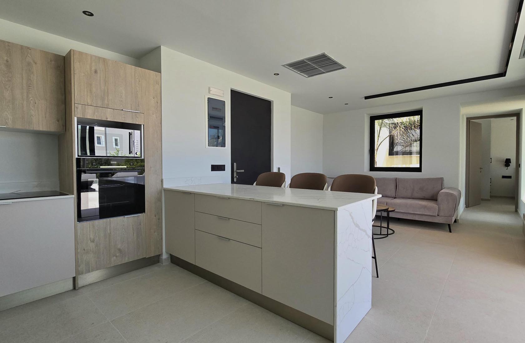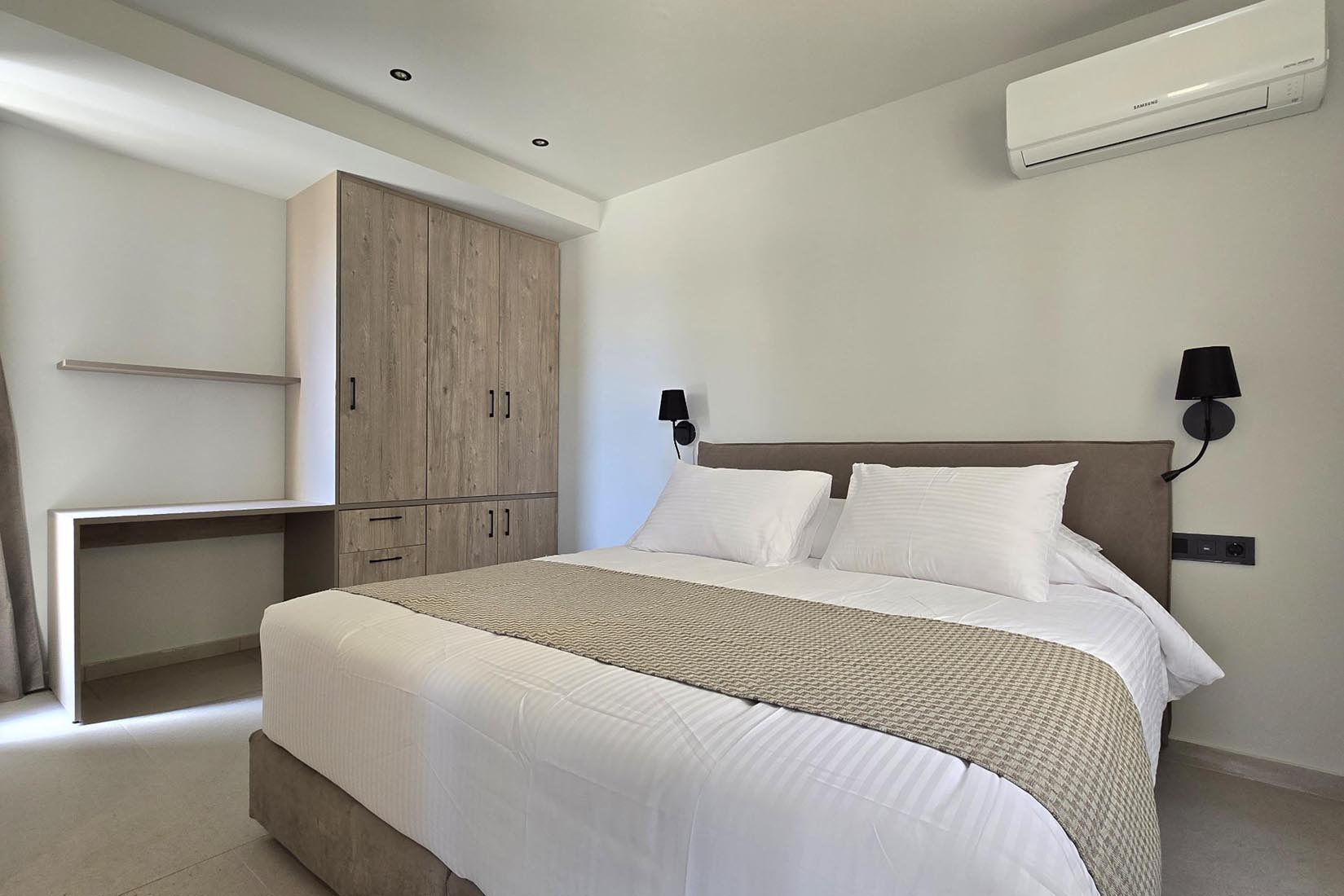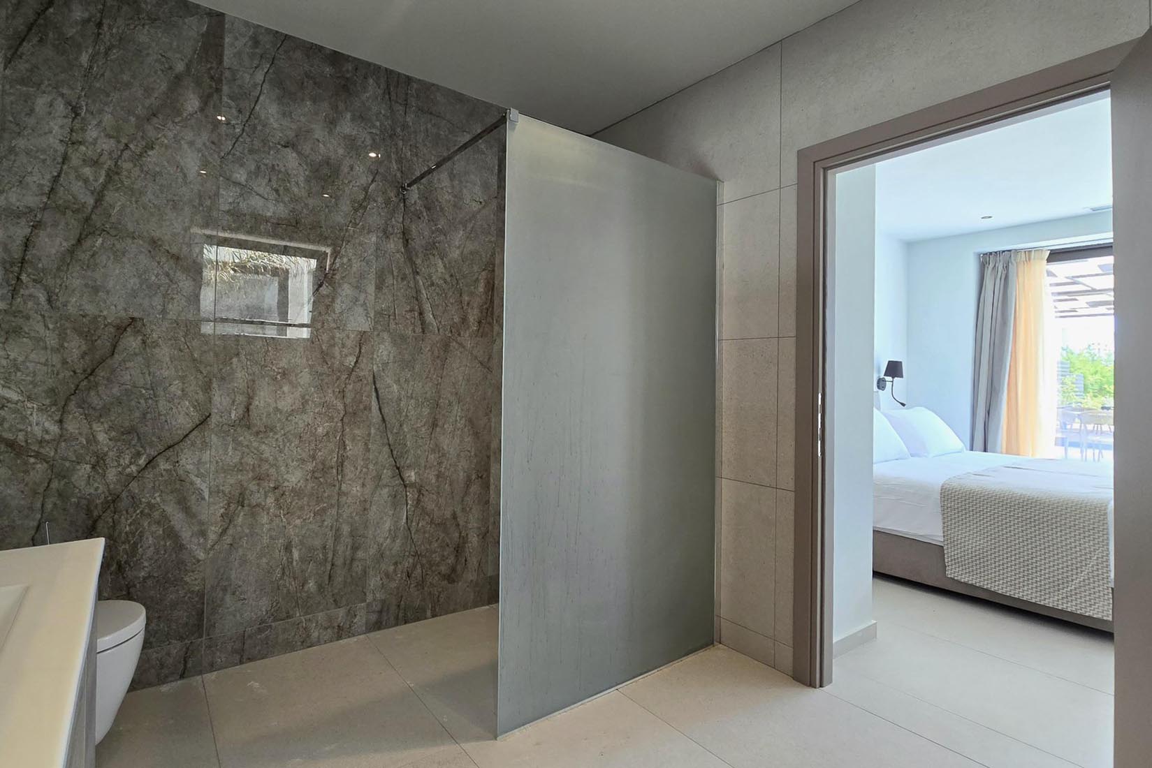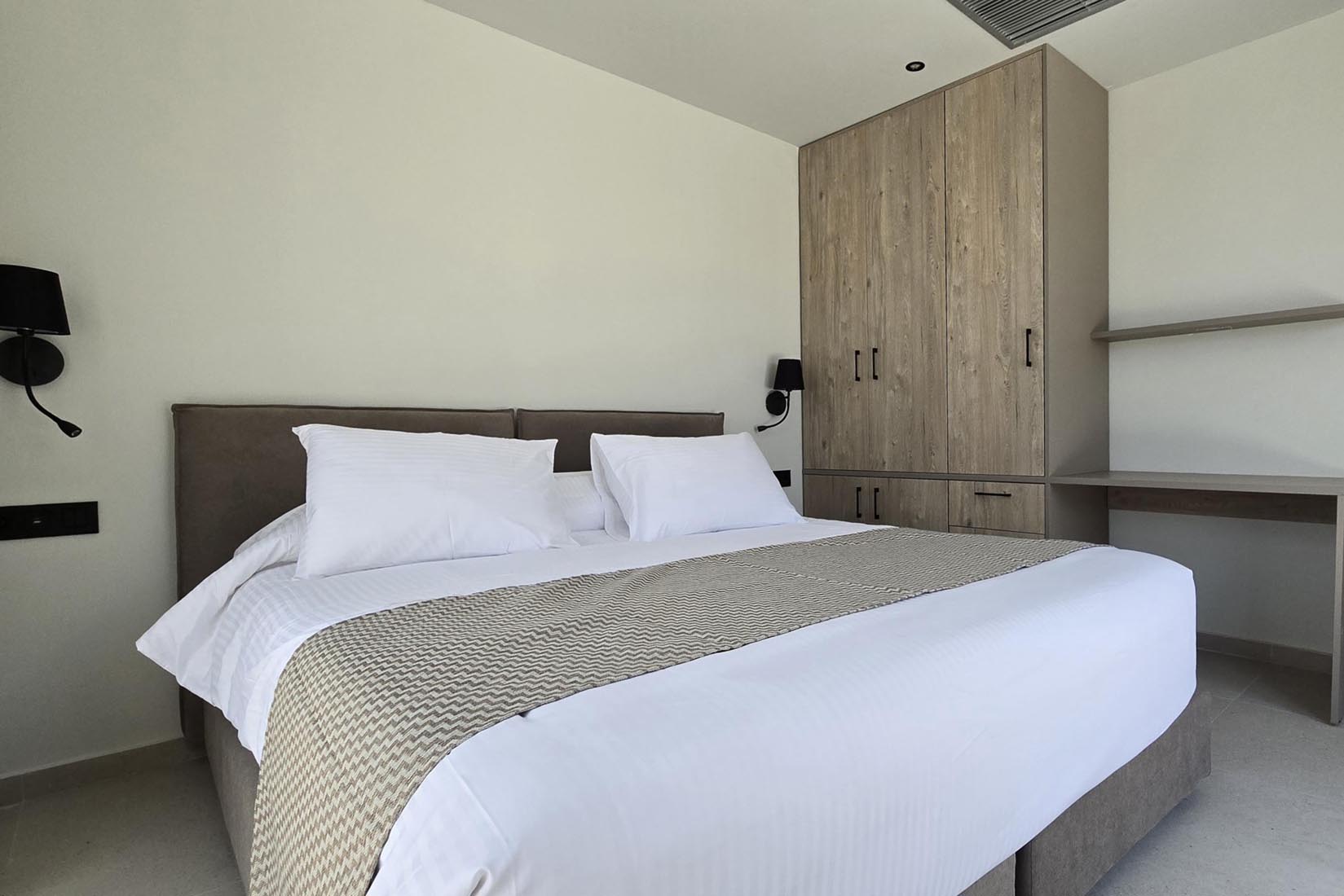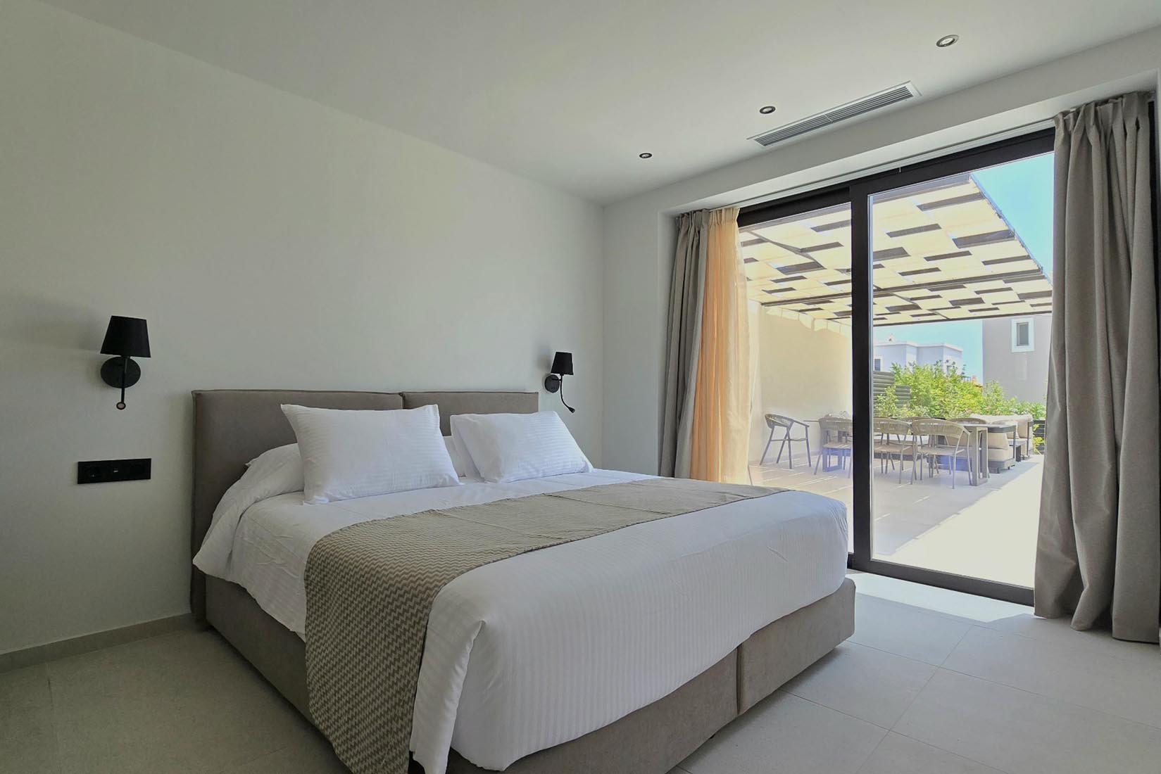 Type A villas are one floor detached luxury villa that hosts up to 6 guests. There are 3 fully air-conditioned bedrooms with unique decorations. All of the bedrooms offer ensuite bathrooms with a shower. There’s a fully equipped kitchen in warm colors, suitable for any meal preparation accompanied by the seating area and the living room. There’s a smart TV and free WIFI access throughout the property. Outdoors, there’s a private swimming pool and jacuzzi with sunbeds and a seating area where you can relax under the rays of the Aegean sun. You can spend your time by your private swimming pool or enjoy a fresh meal prepared in the BBQ installation. Also, there is a shared outdoor gym, so you can stay fit throughout your holidays in Rhodes. As for your entertainment you will find a sharing ping pong table,mini golf& pool table. This amazing property and the beautiful location make the perfect match for a memorable stay and unforgettable holidays in Rhodes!